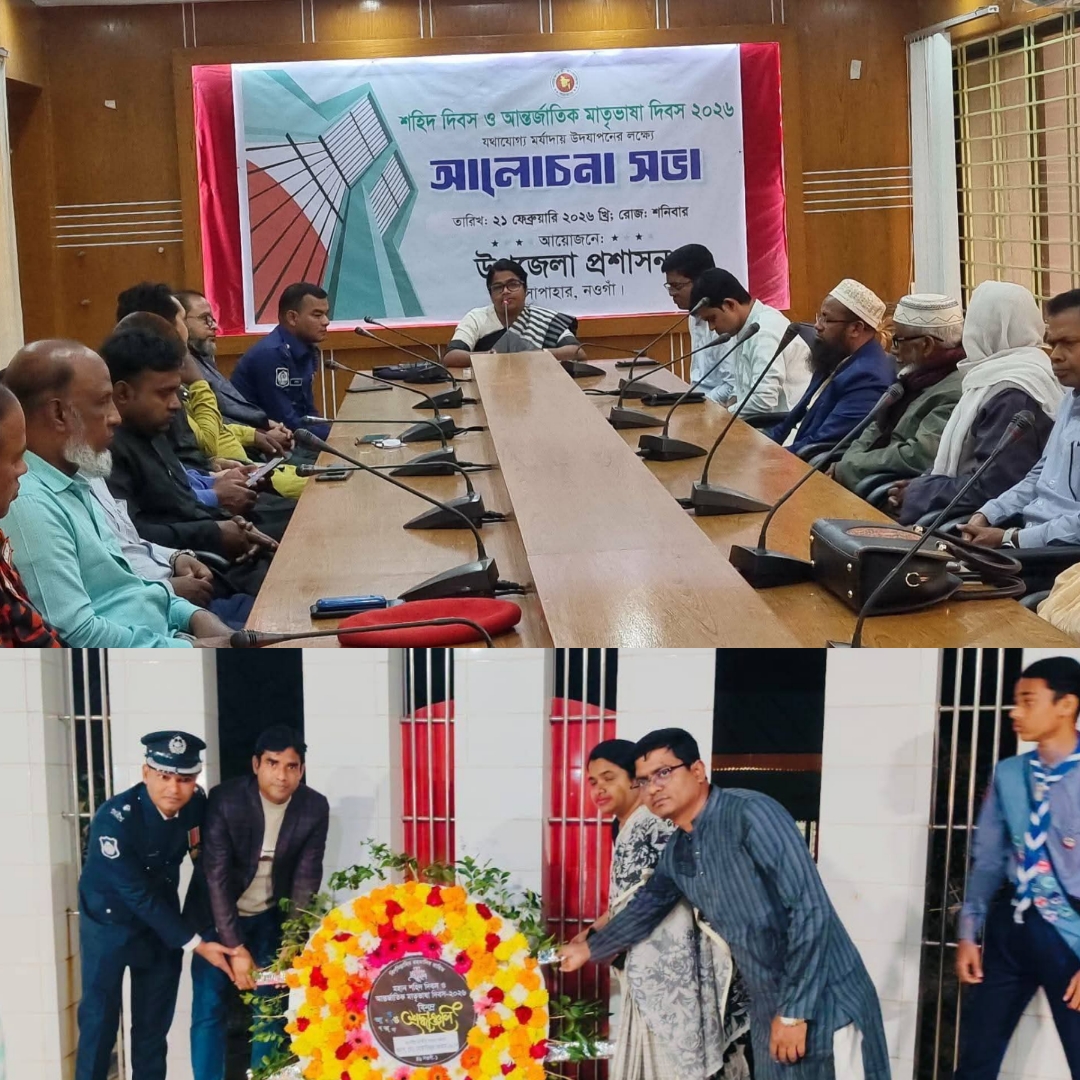 # সাপাহার (নওগাঁ) প্রতিনিধি : নওগাঁর সাপাহারে মহান শহিদ দিবস ও আন্তর্জাতিক মাতৃভাষা দিবস-২০২৬ যথাযোগ্য মর্যাদায় উদ্যাপনের লক্ষ্যে আলোচনা সভা অনুষ্ঠিত হয়েছে। শনিবার (২১ ফেব্রুয়ারি) বেলা সাড়ে ১১টায় উপজেলা পরিষদ সভাকক্ষে উপজেলা প্রশাসনের আয়োজনে উক্ত আলোচনা সভা অনুষ্ঠিত হয়। সভায় সভাপতিত্ব করেন উপজেলা নির্বাহী অফিসার (ইউএনও) রোমানা রিয়াজ।