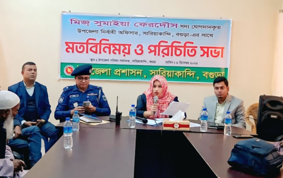 # মিলন,সারিয়াকান্দি প্রতিনিধি: বগুড়ার সারিয়াকান্দতে উপজেলা প্রশাসনের আযোজনে মঙ্গলবার (৯ ডিসেম্বর) দুপুরে উপজেলা পরিষদ সভাকক্ষে নবাগত সারিয়াকান্দি উপজেলা নির্বাহী অফিসার সুমাইয়া ফেরদৌস এর মতবিনিময় সভা অনুষ্ঠিত হয়।