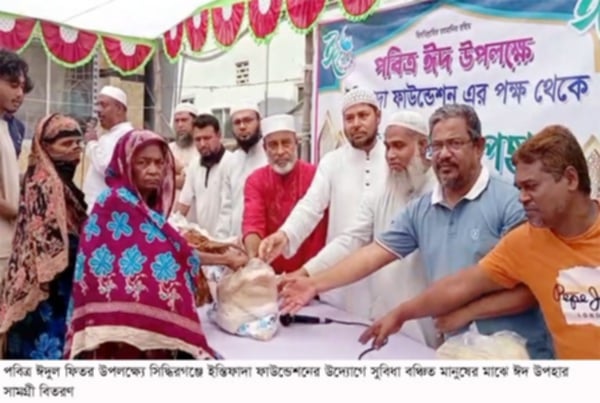 # সিদ্ধিরগঞ্জ প্রতিনিধি : পবিত্র ঈদুল ফিতর উপলক্ষ্যে সিদ্ধিরগঞ্জে ইন্তিফাদা ফাউন্ডেশনের উদ্যোগে সুবিধা বঞ্চিত মানুষের মাঝে ঈদ উপহার সামগ্রী বিতরণ করা হয়েছে। শনিবার (২৯ মার্চ) দুপুরে সিদ্ধিরগঞ্জের পাইনাদী নতুন মহল্লা পিএমের মোড়ে এ ঈদ উপহার সামগ্রী বিতরণ করা হয়। ইন্তিফাদা ফাউন্ডেশনের পরিচালক মো: রফিকুল ইসলামের সভাপতিত্বে উক্ত অনুষ্ঠানে উপস্থিত ছিলেন, বিশিষ্ট সমাজ সেবক এস এম মেহেদী হাসান, মো: মওদুদী বাবু, ইন্তিফাদা ফাউন্ডেশনের সদস্য সোহেল সরকার, ইউসুফ হোসেন, ইয়াছিন, আরাফাত। এসময় অন্যান্যদের মধ্যে উপস্থিত ছিলেন, সিদ্ধিরগঞ্জ থানা বিএনপির সাবেক যুগ্ম আহ্বায়ক গাজী মনির হোসেন, নারায়ণগঞ্জ মহানগরী জামায়াতে ইসলামীর সহ-সাধারণ সম্পাদক জামাল হোসেন, জামায়াতে ইসলামী সিদ্ধিরগঞ্জ দক্ষিন থানার আমির কাফরুল আহমেদ ও নাসিক ১নং ওয়ার্ড বিএনপির সাধারণ সম্পাদক নুরউদ্দিন নুরু সহ এলাকার গন্যমান্য ব্যক্তিবর্গ প্রমূখ।#