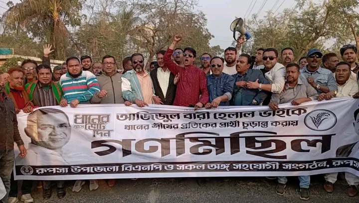 শহিদুল্লাহ্ আল আজাদ. স্টাফ রিপোর্টারঃ আগামী ১২ ফেব্রুয়ারি ত্রয়োদশ জাতীয় সংসদ নির্বাচনে খুলনা-৪ আসনে বিএনপি মনোনীত ধানের শীষের প্রার্থী ও বিএনপি কেন্দ্রীয় তথ্য বিষয়ক সম্পাদক আজিজুল বারী হেলালের নির্বাচনী গণমিছিল রূপসার বিভিন্ন স্থানে অনুষ্ঠিত হয়েছে। আজ সোমবার (৯ ফেব্রুয়ারি) বিকেল ৫টায় টিএসবি নৈহাটি ও ঘাটভোগ ইউনিয়ন বিএনপির আয়োজনে পূর্ব রূপসা এলাকায় অনুষ্ঠিত হয়। মিছিলটি রূপসা কলেজ চত্বর থেকে মিছিল শুরু হয়ে নৈহাটীর গোডাউন মোড়ে এসে শেষ হয়।
