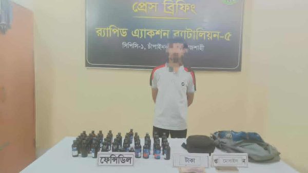 চাঁপাইনবাবগঞ্জ প্রতিনিধিঃ চাঁপাইনবাবগঞ্জ সদর উপজেলায় ৪৯ বোতল ফেনসিডিলসহ এক মাদক ব্যবসায়ীকে গ্রেফতার করেছে র্যাব-৫। শুক্রবার (২৬ সেপ্টেম্বর ২০২৫) বিকেল সাড়ে ৪টার দিকে র্যাব-৫, সিপিসি-১, চাঁপাইনবাবগঞ্জ ক্যাম্পের একটি টহল দল