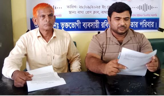 বিশেষ প্রতিনিধি ঃ রাজশাহীর বাঘায় হত্যার হুমকিসহ ব্যবসায়ীক নিরাপত্তা ও ন্যায় বিচারের দাবিতে এবং সত্যকে ধামাচাপা দিয়ে মিথ্যাকে প্রতিষ্ঠিত করার প্রতিবাদে বিএনপির এক নেতার বিরুদ্ধে সংবাদ সম্মেলন করেছেন ভ’ক্তভ’গি