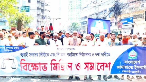 নাজিম হাসান.রাজশাহী জেলা প্রতিনিধি: বাংলাদেশ জামায়াতে ইসলামী রাজশাহী মহানগরীর উদ্যোগে জুলাই সনদের ভিত্তিতে ও পি.আর পদ্ধতিতে নির্বাচনসহ ৫ দফা দাবিতে রাজশাহীতে জামায়াতের বিক্ষোভ সমাবেশ অনুষ্ঠিত হয়েছে। আজ শুক্রবার সকাল