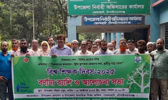# এম. এস. আই শরীফ, ভোলাহাট(চাঁপাইনবাবগঞ্জ) প্রতিনিধিঃ চাঁপাইনবাবগঞ্জের ভোলাহাটে উপজেলা মাধ্যমিক শিক্ষা দপ্তরের আয়োজনে বিশ্ব শিক্ষক দিবস ২০২৫ উদযাপন উপলক্ষ্যে বর্ণাঢ্য রেলী ও আলোচনা সভা রোববার (০৫ অক্টোবর ২০২৫) বেলা